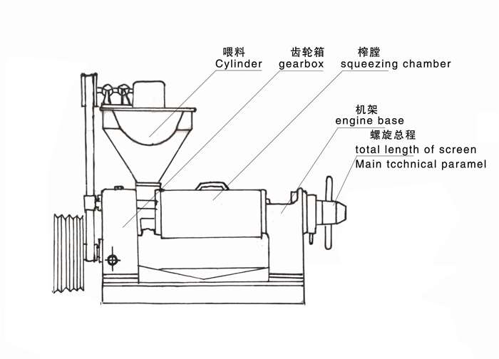 榨油機(jī)運(yùn)轉(zhuǎn)時(shí),將處理好的料胚帶如料斗,油料從料斗進(jìn)入榨膛。有榨螺的螺旋向里推進(jìn),進(jìn)行壓榨。
